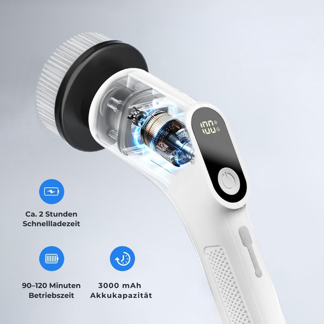 Die rotierende Bürste beseitigt Schmutz gründlich und spart dir Kraft und Zeit im Vergleich zum manuellen Putzen.